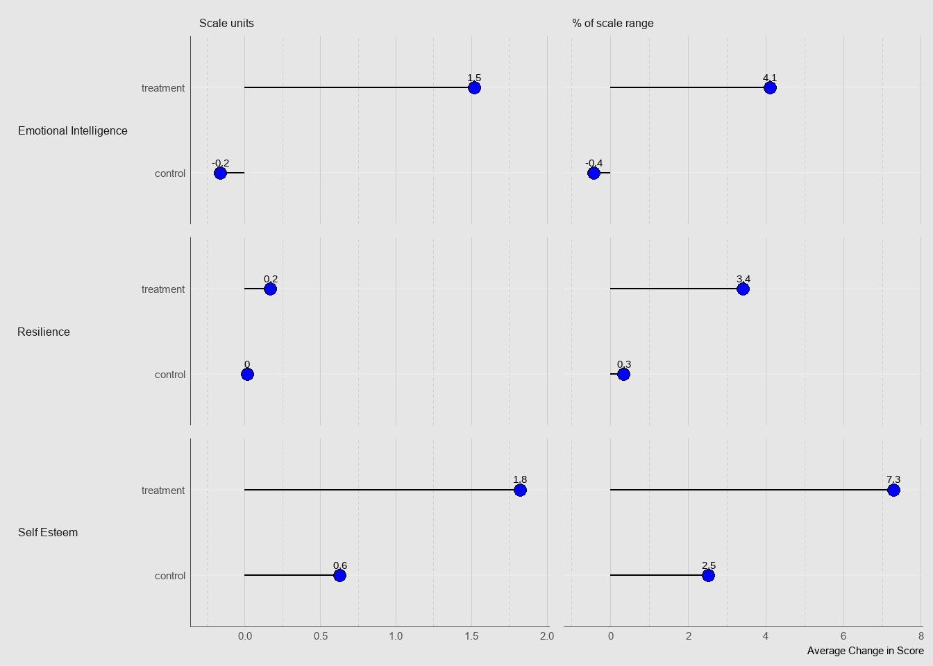 The treatment group’s average scores increased slightly on each of the three scales. This is consistent with our expectations, in that – compared to where they started – participants are likely to leave the program with incremental, rather than transformational improvements in these skills. Even the treatment group’s largest observed change, a 1.8 scale point (7.3 % of the scale’s range) increase in self-esteem, wouldn’t represent a change from a person with low self-esteem to a person with high self-esteem.