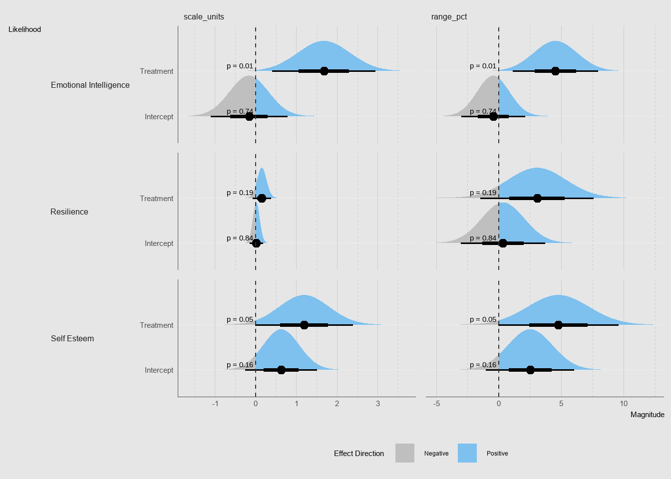 IMM+ has shown promising results in previous evaluations, and has received strong anecdotal feedback from its participants. Participants and practioners think it works, and we expect that to born out in the data. However, we also know that each of these traits is as much a part of an individual’s personality as it is a skill that can be quickly learned and developed. We expect that the program will have a positive effect on these traits, but we do not expect the magnitude of that effect to be dramatic. Rather than a sudden change in the distribution of scores, we expect to see a shift in the mean score of the treatment group relative to the control group.